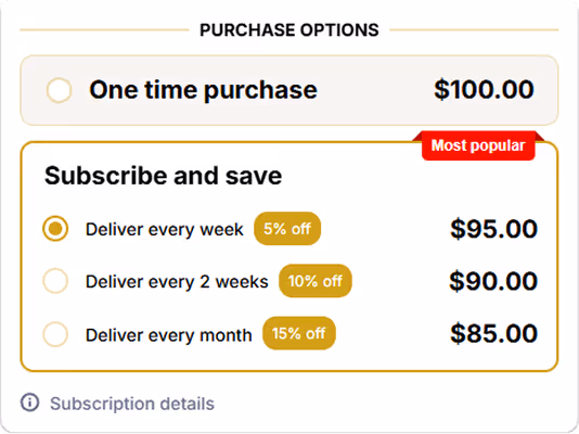 Create subscription plans in minutes with a simple, intuitive setup. Choose delivery frequency, set subscriber-only discounts, and customize pricing without touching code. Build the exact subscription offer you want and make it easy for customers to commit long-term.