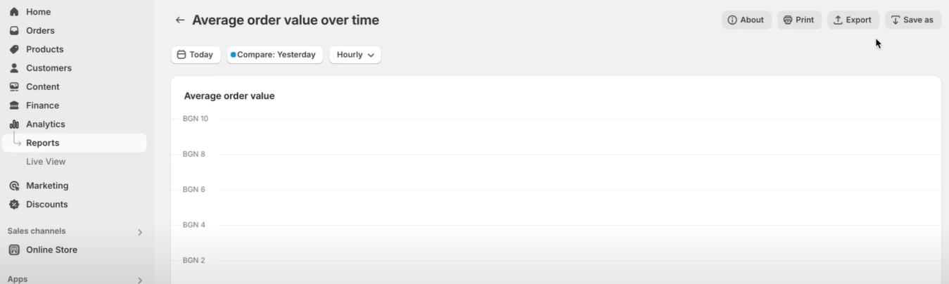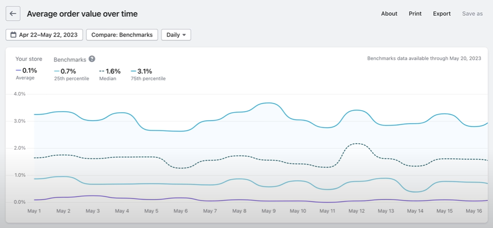 If you want to compare your AOV to those of stores similar to yours, you can use Shopify benchmarks in “Reports” (under “Analytics”). The report shows your AOV over time and displays the following:
