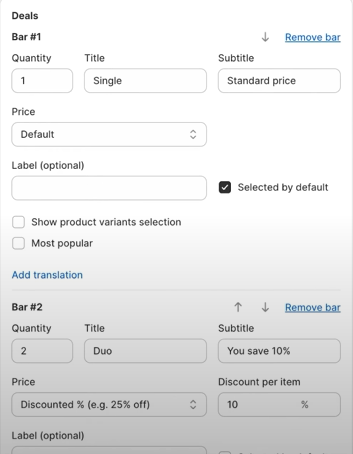 Scroll down to the Deals section to set quantity breaks or volume discounts for your bundle. Here, you can input a Quantity, Title, Subtitle, and Discount per item for each bar in your bundle.