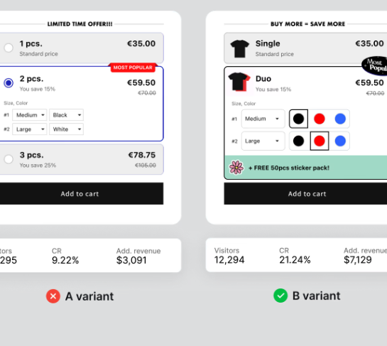 A/B testing your bundle setups will allow you to show different versions to different customers simultaneously. That way, you can compare important metrics like conversion rates, average cart value, and total profits. The goal is to ensure that you only run campaigns that maximize your AOV.