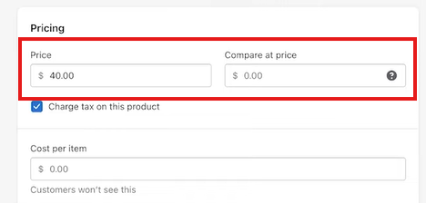 It’s time to use Shopify’s in-built “Compare at price” feature to showcase the value of your bundle to customers. At the Pricing section, enter the discounted bundle price in the Price field and the combined market price of all items in the Compare at price field.