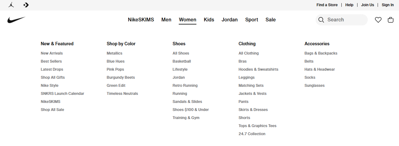 Seamless navigation allows visitors to find the products they want without stress. By reducing friction, you make it easier for leads to move from product pages to thank you pages, thereby improving your conversion rate. Think of the simple but large menu options on the official Nike store.