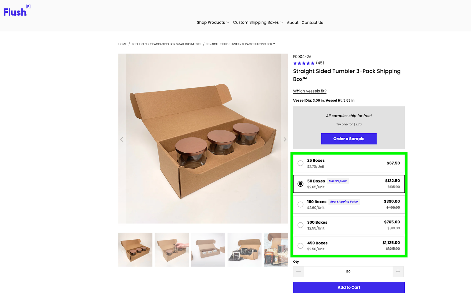 US-based shipping brand Flush Packaging used volume discounts to increase AOV by 23%. If you want to achieve similar results, use price per unit and price comparisons to help customers understand the value they get at different volumes. We recently posted an article on the best Shopify apps with volume discounts.