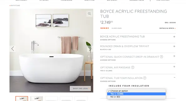 Home fixtures brand Signature Hardware uses checkout add-ons to frequently double total order value. They present extras such as foam insulation or air massage on their bathtub checkout page. Seeing this, customers realize they can save significantly on shipping, so many gladly accept the upsell.